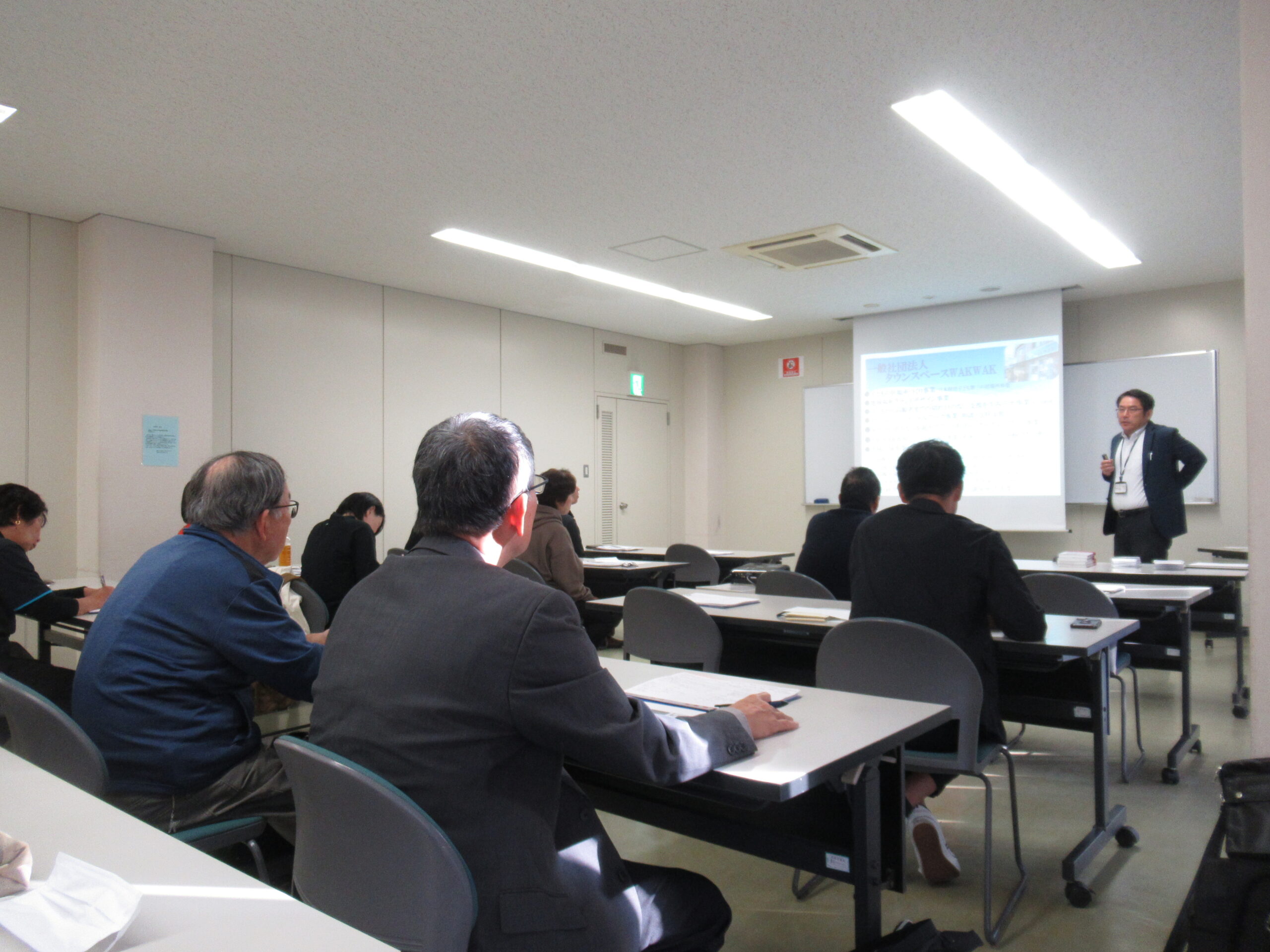 フィールドワークでは私から挨拶を兼ねて富田地区の概況を簡単に挨拶。引き続き、岡本工介業務執行理事兼事務局長から「富田地域におけるまちづくりの変遷」「社会的包摂へのWAKWAKの取り組み」についてパワーポイントを使いながら説明をさせていただきました。