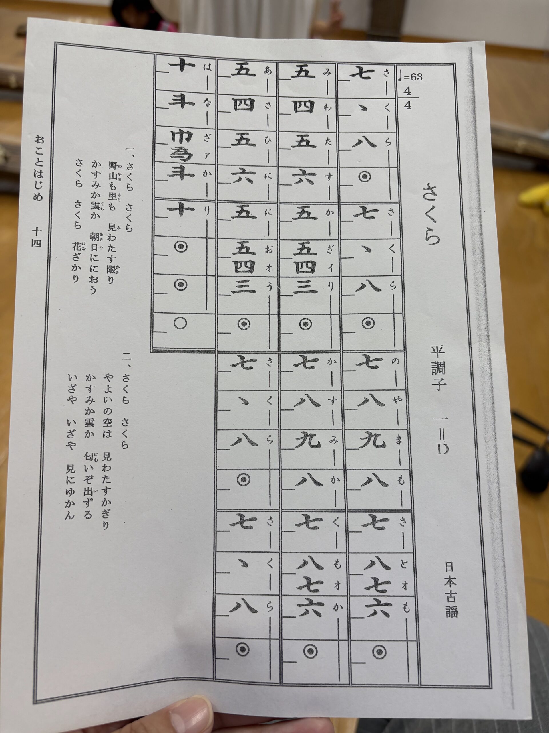 その後、お箏の説明を受け、爪を付けて「さくら」を練習しました。爪で弾くというのが、難しい子・・・すすっとマスターして、少し難しい曲をさらに弾く子・・・大学生がマンツーマンでついてくれていたので、それぞれのペースに合わせることができていました。