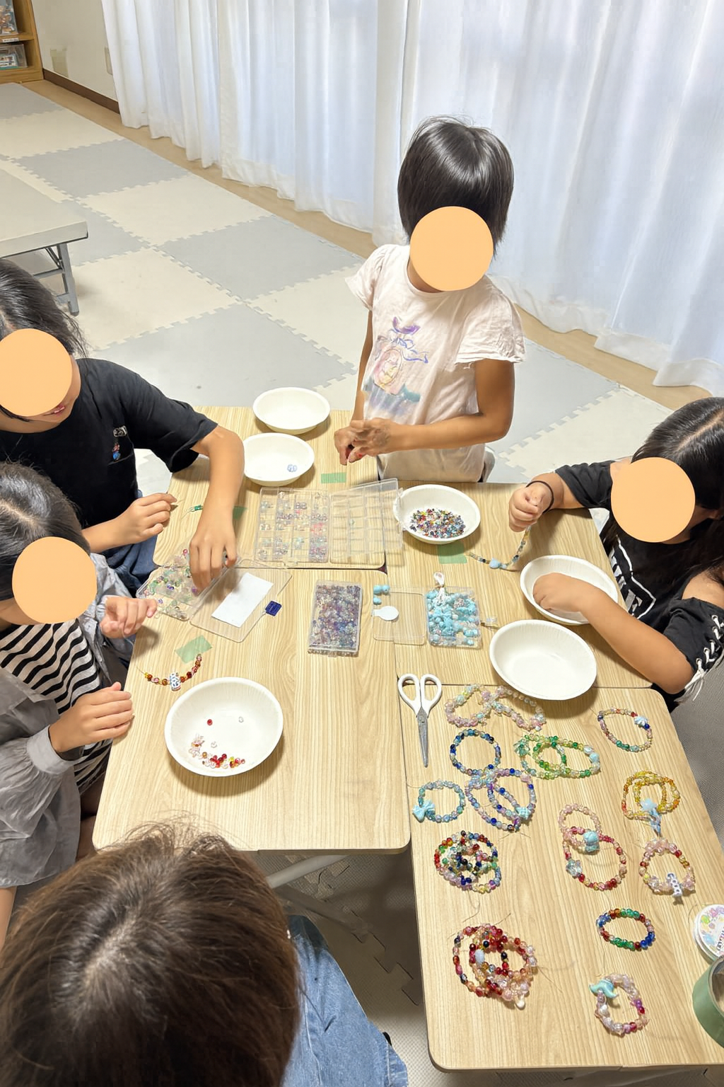 この企画は、今年の夏休みに、ブレスレットづくりで講師の先生をお招きして、男女問わず楽しんでやっていたものです。