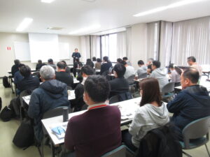 会場の富田ふれあい文化センターに戻り、再び岡本工介業務執行理事兼事務局長より「富田エリア事業」について講義。活発な質疑の後、受講生のみなさんはA~G各班に分かれてグループ討議。