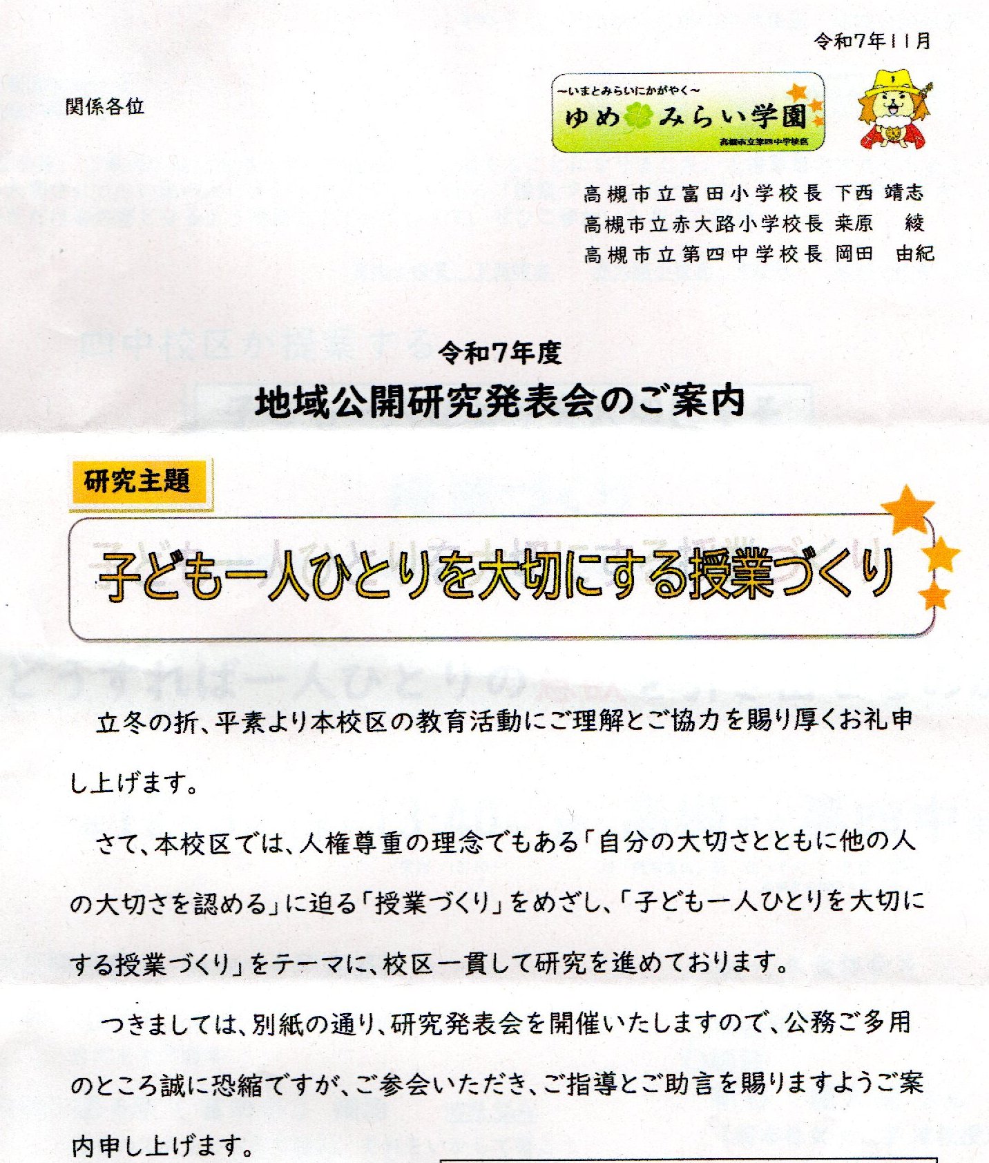 12月3日(水)、地元第四中校区富田小学校・赤大路小学校・第四中学校3校主催による「地域公開研究発表会」が開催されました。