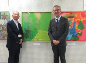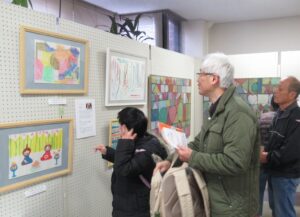 二日目は高槻市障がい福祉課、コミュニティ推進室、子ども青少年課等市関係課のみなさまはじめ昨日都合で来られなかった方も多くご来場。特別出展いただいている東淀川区「西淡路希望の家」から作家の石田さん、神田さん、職員のみなさんもわざわざ会場へご来場いただきました。