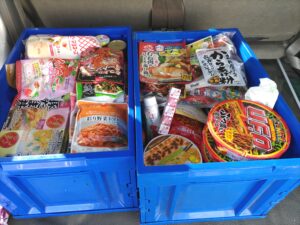 今月はコンテナ2箱分141品目、28.2㎏を回収させていただきました。今回はレトルト食品、お菓子等が多く年末・年始を控えみなさんに喜んでもらえそうです。