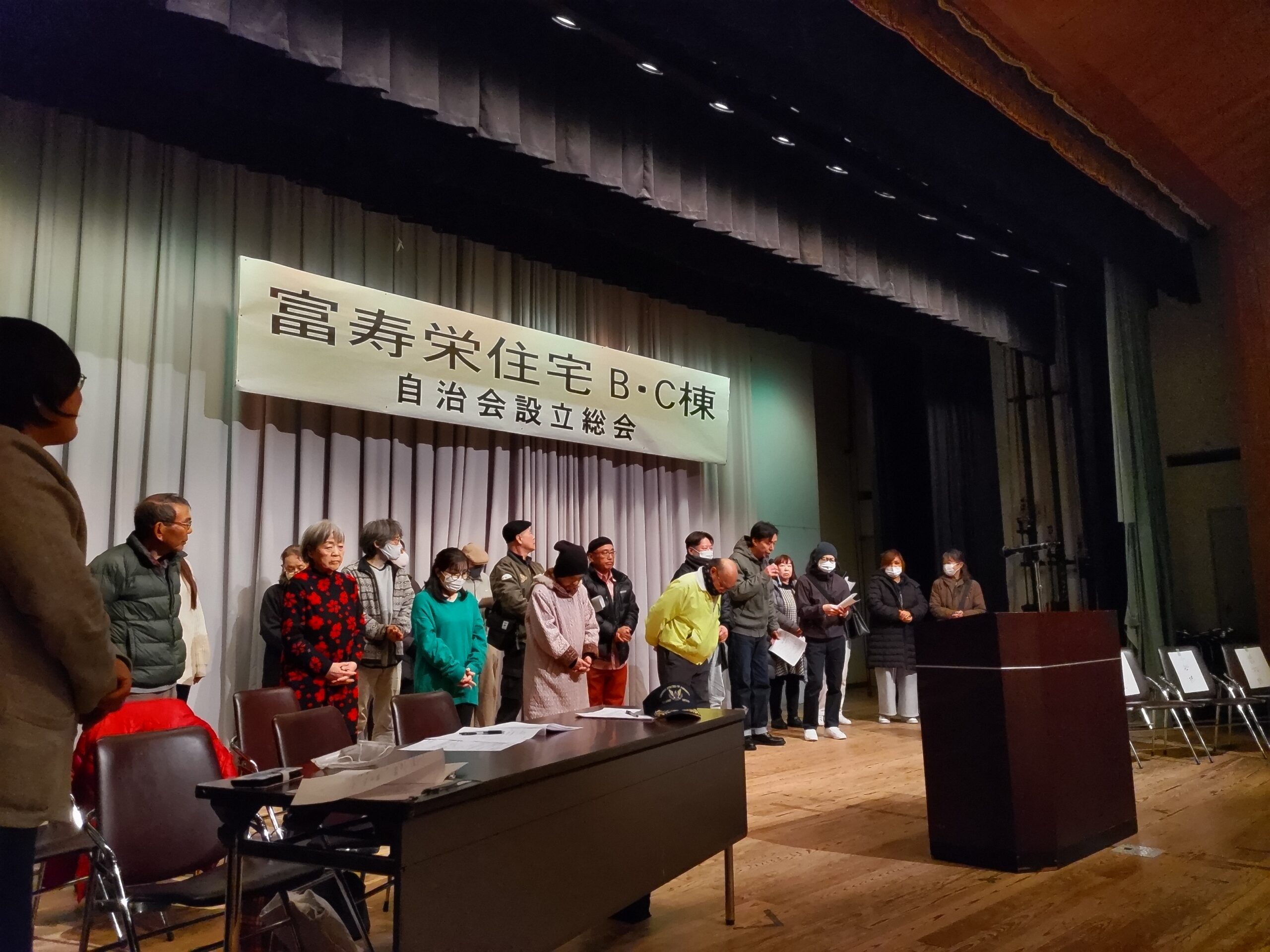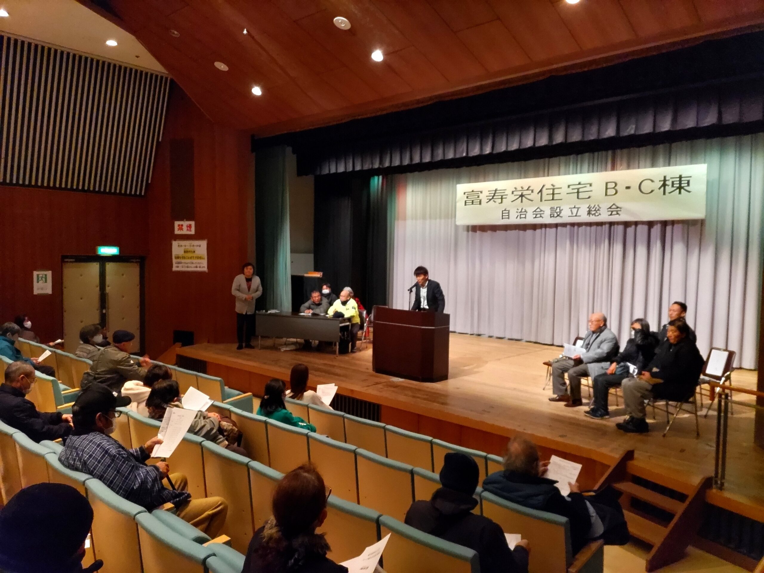 1月24日(土)午後1時より、昨年12月~1月に第二次移転が完了した富田富寿栄住宅B・C棟自治会の合同設立総会が富田ふれあい文化センター大ホールで開催されました。